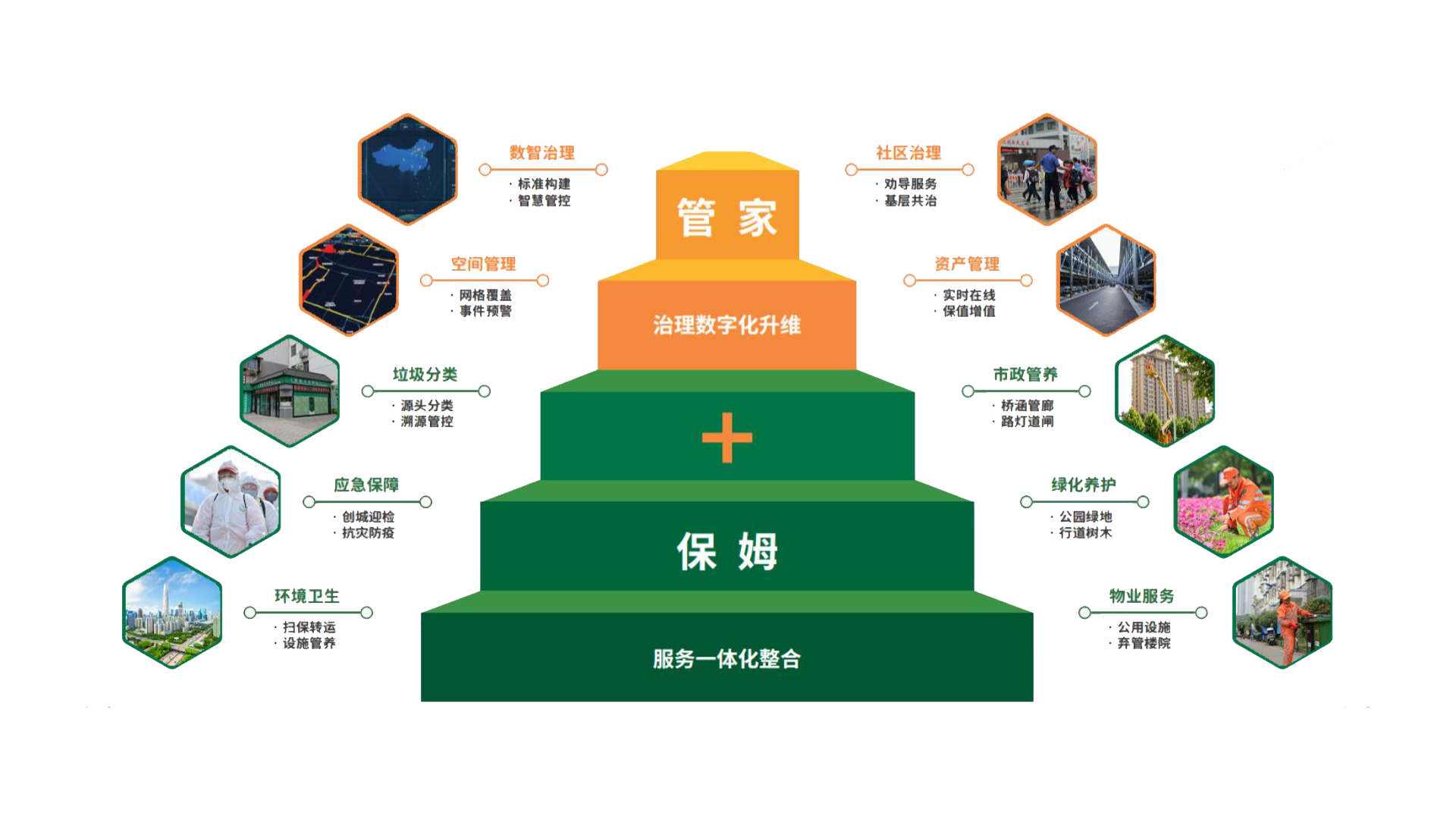 業務涵蓋環境衛生、垃圾分類、市政管養、綠化養護、物業服務、應急保障等領域。十余年來,公司構筑了智慧城市綜合服務平臺體系,實現運營管理的全系統數字化管理,在智慧化、裝備化、精益化方面持續投入,為客戶提供更高品質的服務,讓城市更加干凈、整潔、有序、安全,創造守護美好生活,共建共享美麗中國。